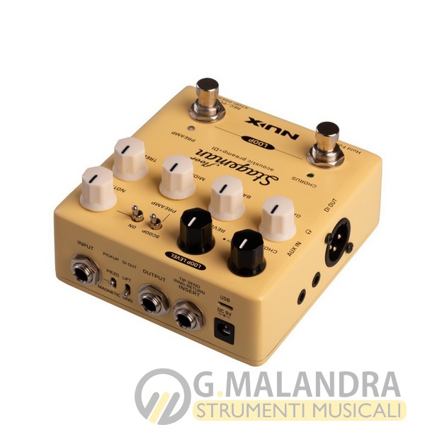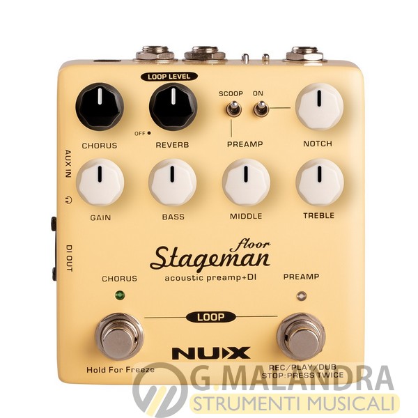 NUX Stageman Floor è un preamp per acustica analogico con effetti digitali e looper integrato. Equipaggiato con un eq 3-bande con controllo speciale sui medi, notch filter regolabile e controllo gain.