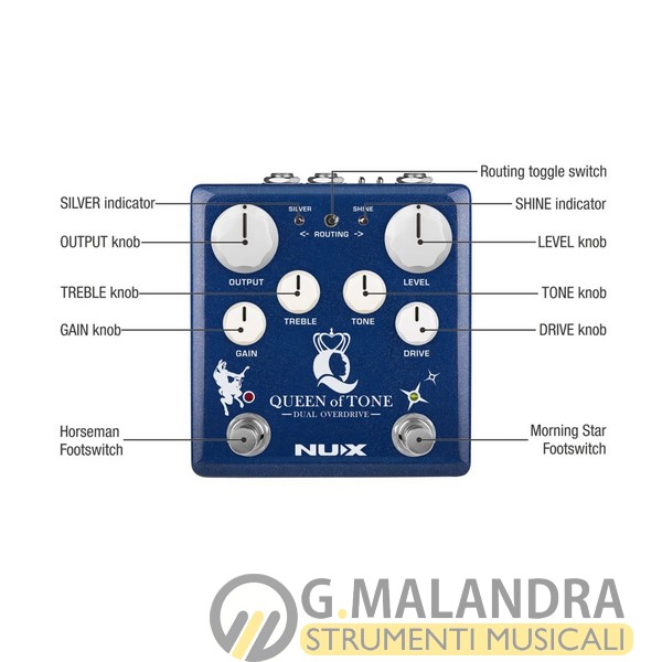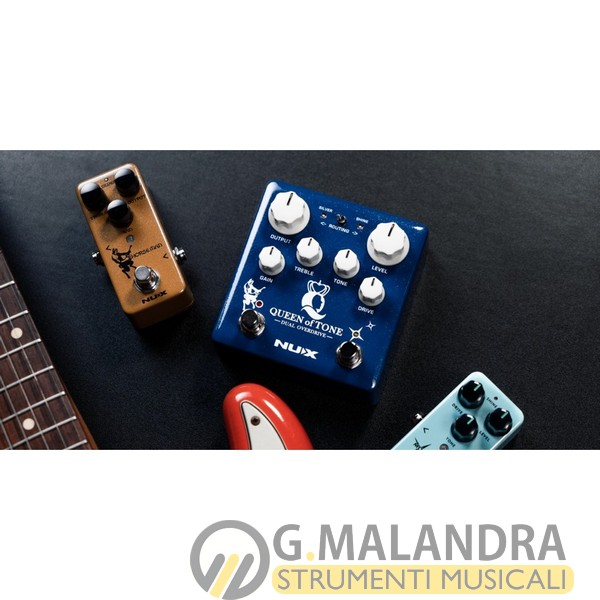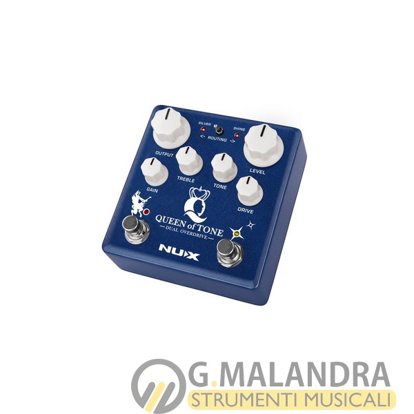 Dopo Ace of Tone, NUX lancia sul mercato un altro pedale concepito per darti due overdrive differenti in un unico stomp box: Queen of Tone ti dà la possibilità di avere un Horseman e un Morning Star nello stessa unità, nel formato compatto che ha fatto la fortuna di tanti altri pedali targati NUX. Due overdrive molto diversi in un unico pedale che farà la felicità del chitarrista desideroso di spaziare senza limiti. ??Horseman è basato sul leggendario overdrive Centaur, con un circuito modificato per accedere alla funzione secondaria semplicemente tenendo premuto l’interruttore a pedale (modalità SILVER). La modalità Gold ricrea l’illustre overdrive trasparente Gold Centaur, mentre la modalità Silver è una versione potenziata con una gamma di guadagno estesa (Silver Centaur). ?Morning Star è basato sul leggendario circuito Bluesbreaker: un drive molto trasparente e a basso guadagno dotato della modalità SHINE che rende il suono più brillante e cristallino.