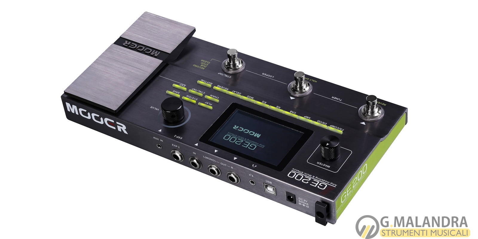 La catena del segnale è personalizzabile all’interno di ogni preset, mentre il display a colori da 3,5″ rende la programmazione chiara ed immediata. Il pedale di espressione incorporato ed i tre footswitch dotati di led, garantiscono il pieno controllo del GE200. Il looper integrato registra fino a 52 secondi con effetti di half-speed e reverse. Grazie alla batteria elettronica inclusa e all’ingresso ausiliario, è possibile esercitarsi a casa su performance reali e basi. Collegando il GE200 ad un PC tramite USB è possibile utilizzarlo come scheda audio per registrare direttamente su di una DAW. Con uscite e monitoraggio completamente configurabili, GE200 diventa il fulcro principale dell’home recording! Il tutto alloggiato in un robusto chassis di alluminio, che garantisce protezione e affidabilità!